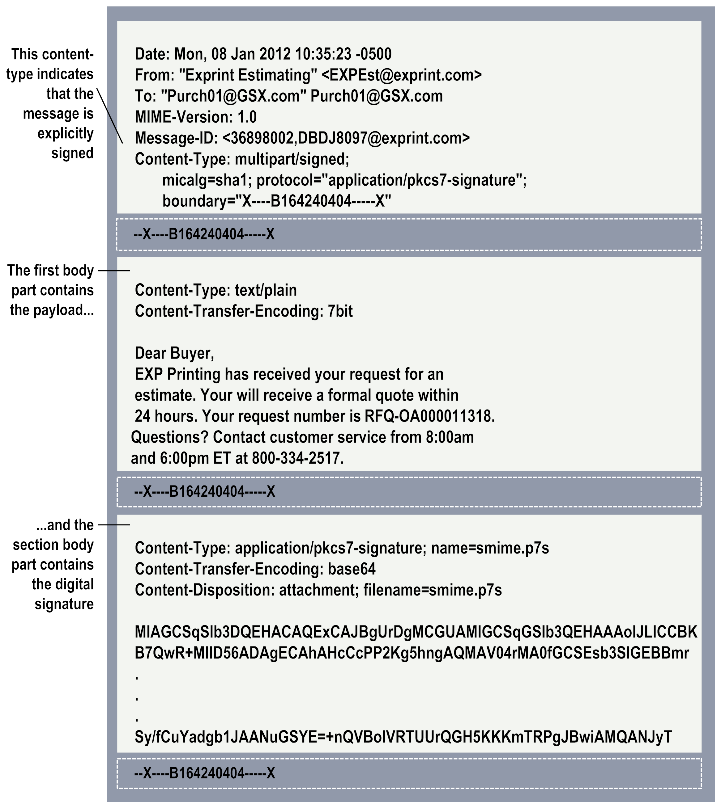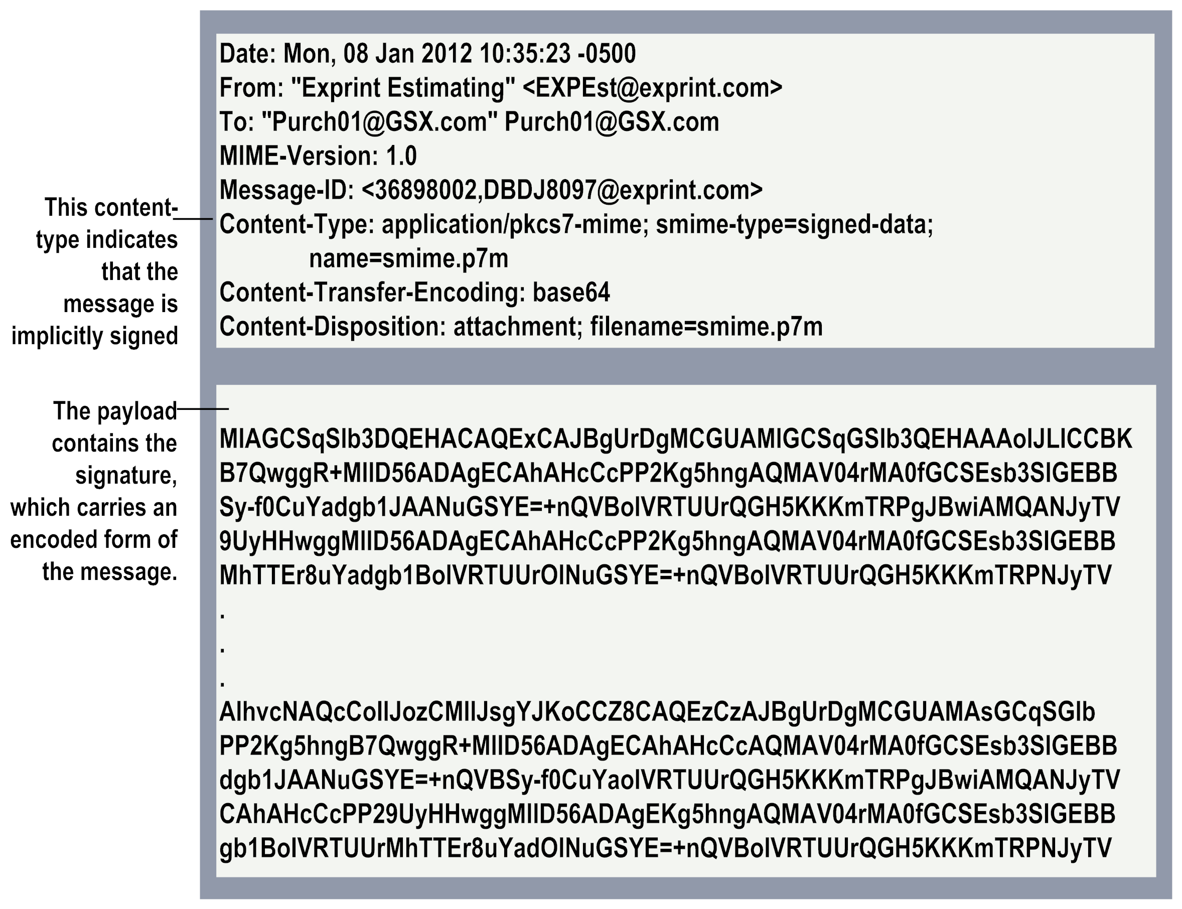 The following is an example of an explicitly signed MIME message. Notice that the message has two body parts: the first part contains the payload; the second part contains the signature.
