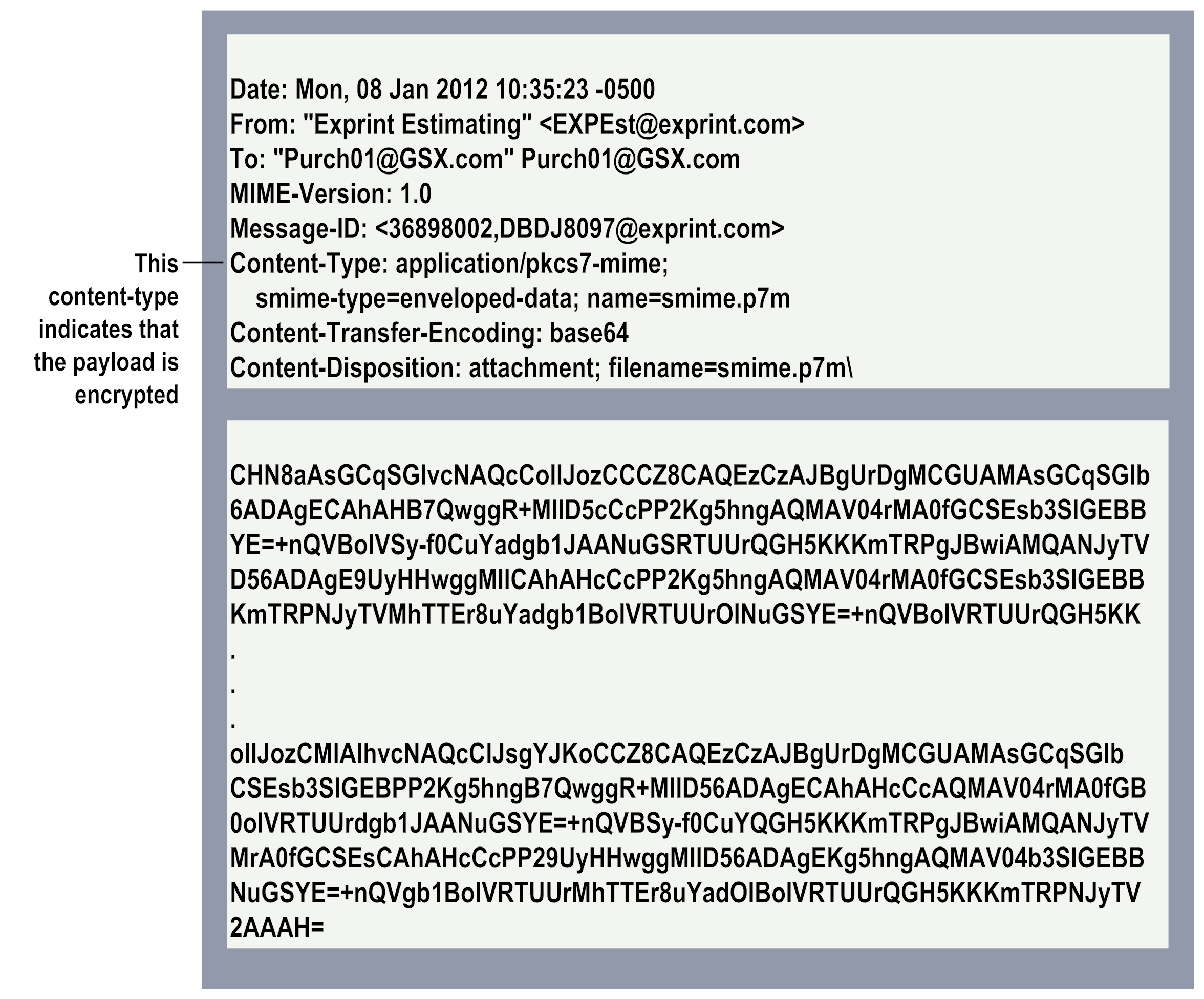 The following is an example of an encrypted message. Note that its Content-Type header field is set to “application/pkcs7-mime” (required for encrypted messages) and that the payload contains the encrypted message.