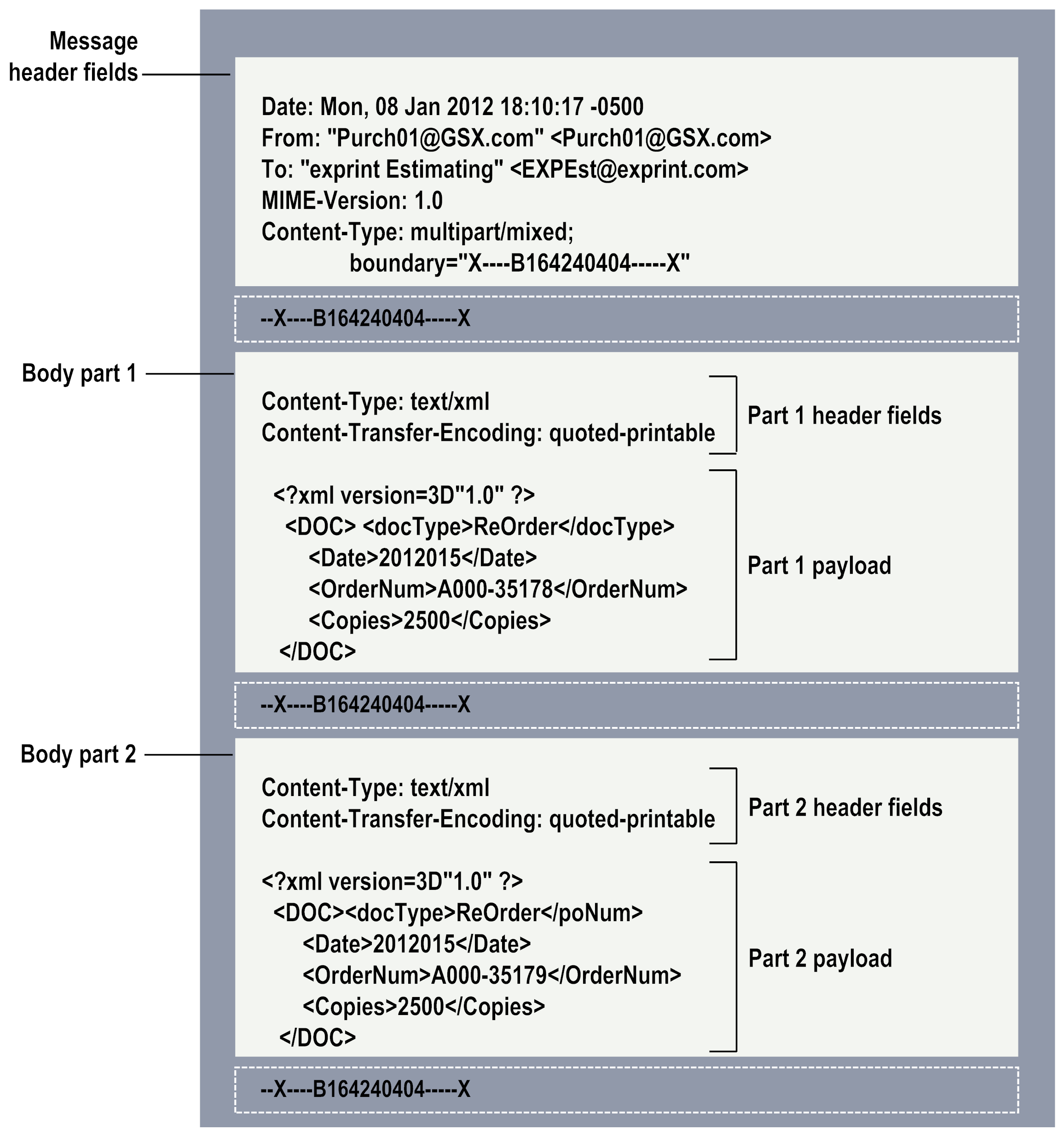 Message headers apply to the entire message. Part headers apply only to the body part in which they appear. The following example shows a MIME message with two body parts.