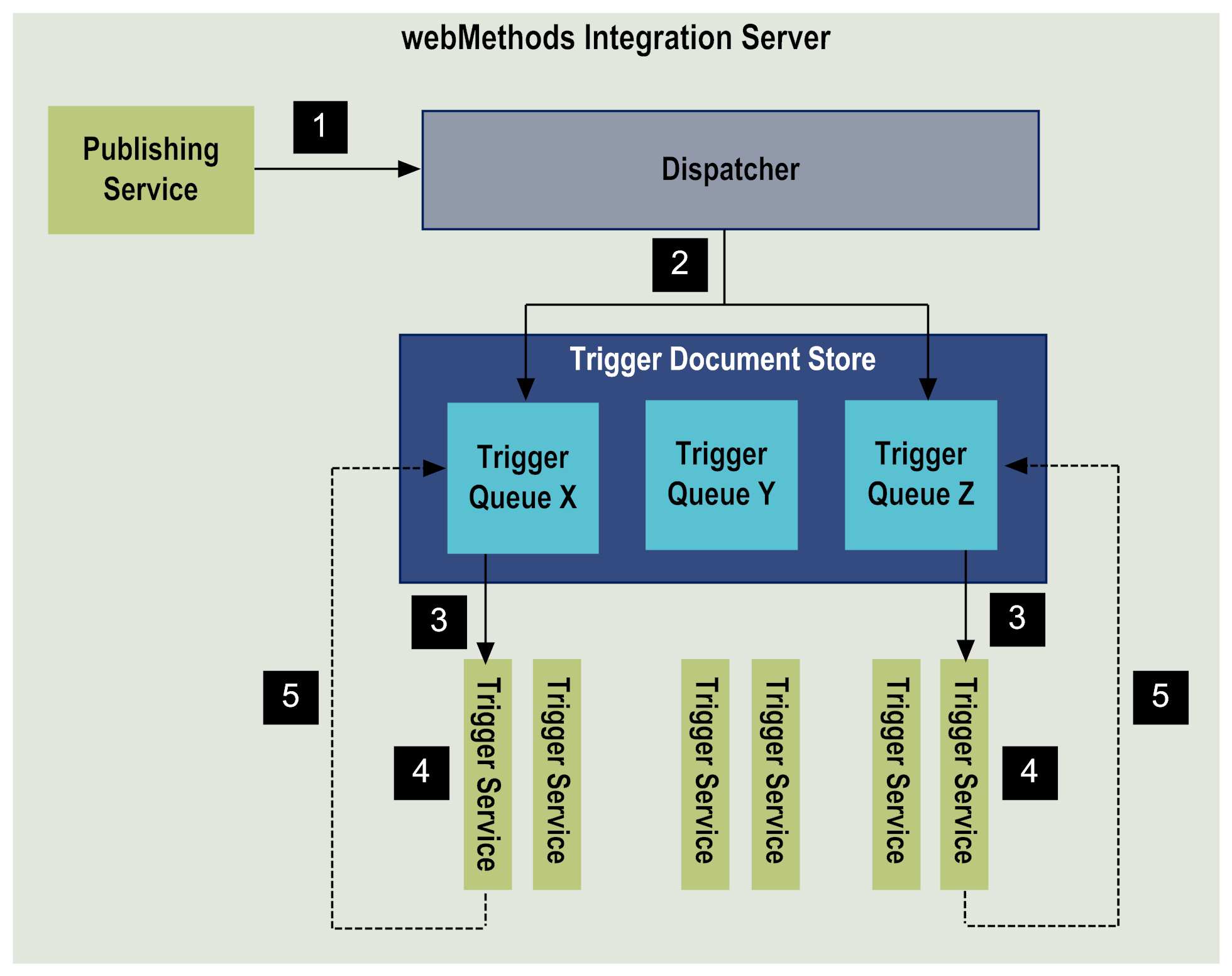 5 | After the trigger service executes to completion (success or error), one of the following occurs:  If the trigger service executed successfully, Integration Server sends an acknowledgement to the trigger queue (if this is a guaranteed document), removes the document from the trigger queue, and returns the server thread to the thread pool.  If a service exception occurs, the trigger service ends in error and Integration Server rejects the document, removes the document from the trigger queue, and returns the server thread to the thread pool. If the document is guaranteed, Integration Server sends an acknowledgement to the trigger queue.  If a transient error occurs during trigger service execution and the service catches the error, wraps it and re-throws it as an ISRuntimeException, then Integration Server waits for the length of the retry interval and re‑executes the service using the original document as input. If Integration Server reaches the maximum number of retries and the trigger service still fails because of a transient error, Integration Server treats the last failure as a service error. For more information about retrying a trigger service, see webMethods Service Development Help. |