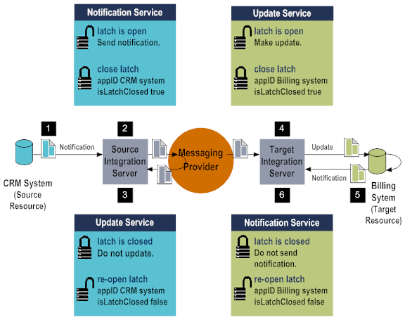 2 | A notification service that you create to notify targets of a data change invokes the pub.synchronization.latch:isLatchClosed built‑in service to determine whether the latch for the object is open or closed. Initially for the source, the latch for the object that was changed is open. This indicates that updates can be made to this object. The object is identified in the cross-reference table by the following cross-reference table fields and the latch is considered open because isLatchClosed is false: | |||