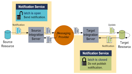 Integration Server builds the canonical document and publishes it. The notification service should include logic that closes the latch to prevent a circular update.