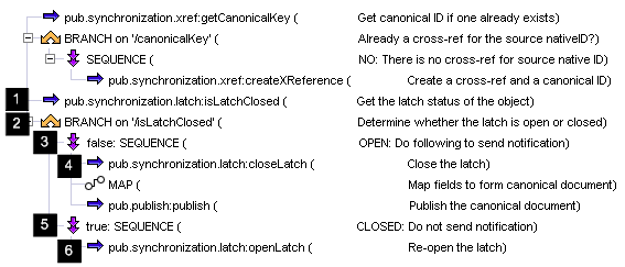 5 | Build a sequence of steps to execute when the latch is closed. Because the Label property for the SEQUENCE flow operation is set to true, this sequence of steps is executed when the isLatchClosed variable is true, meaning the latch is closed. When the latch is closed, notification of the data change has already been published. As a result, the notification service does not need to build or publish the canonical document. This sequence of steps simply re-opens the latch. | |
