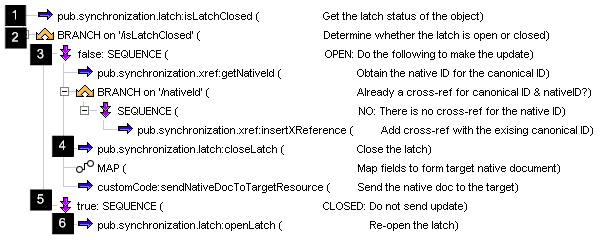 5 | Build a sequence of steps to execute when the latch is closed. Because the Label property for the SEQUENCE flow step is set to true, this sequence of steps is executed when the isLatchClosed variable is true, meaning the latch is closed. When the latch is closed, the resource has already made the equivalent data change. As a result, the update service does not need to build or send a native document to the target resource. | |