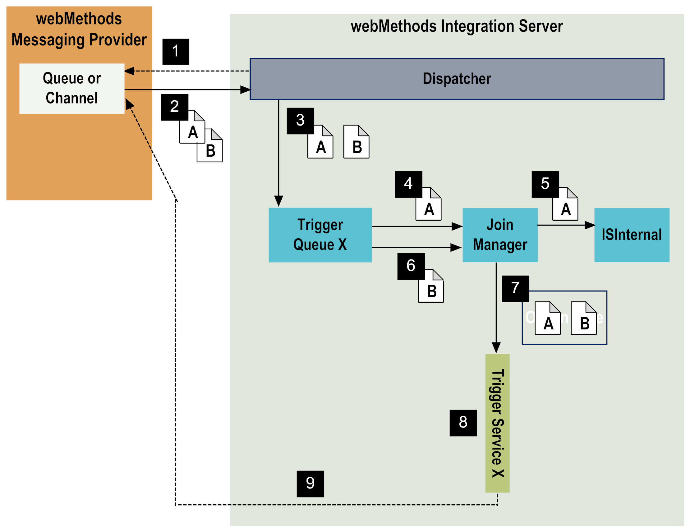 9 | After the trigger service executes to completion (success or error), one of the following occurs:  If the service executes successfully and documentB is guaranteed, Integration Server acknowledges receipt of documentB to the messaging provider. Integration Server then removes the copy of the documentA from the ISInternal database and removes the copy of documentB from the trigger queue.  If a service exception occurs, the service ends in error and Integration Server rejects the join document. If documentB is guaranteed, Integration Server acknowledges receipt of documentB to the messaging provider. Integration Server then removes the copy of the documentA from the ISInternal database and removes the copy of documentB from the trigger queue. Integration Server sends an error notification document to the publisher.  If the trigger service catches a transient error, wraps it, and re-throws it as an ISRuntimeException, then Integration Server waits for the length of the retry interval and re-executes the service using the original document as input. If Integration Server reaches the maximum number of retries and the trigger service still fails because of a transient error, Integration Server treats the last failure as a service error. For more information about retrying a trigger service, see webMethods Service Development Help. Note: A transient error is an error that arises from a condition that might correct itself later, such as a network issue or an inability to connect to a database. |