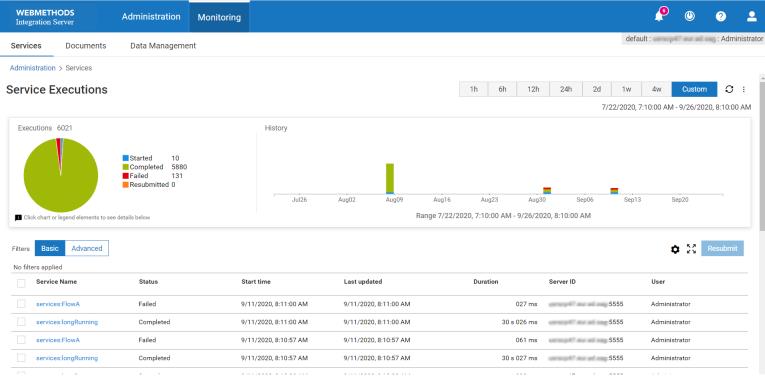 Monitoring: The Monitoring tab allows you to monitor flow services and coded services such as Java services. You can monitor documents published or subscribed by webMethods Broker clients, documents that are in doubt, that have failed, or that have exhausted trigger retries. You can also get the error details for services and documents. Furthermore, you can edit service pipelines and documents and resubmit them.