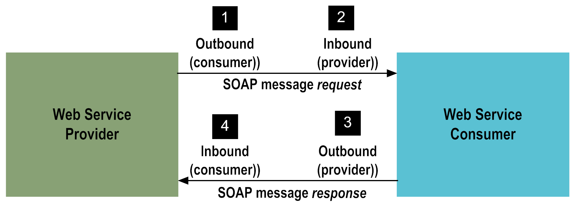 1 | The web service consumer constructs an outbound request and sends it to a web service provider. |